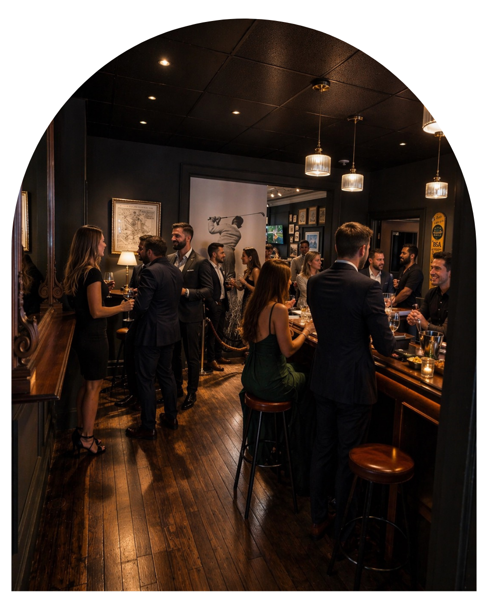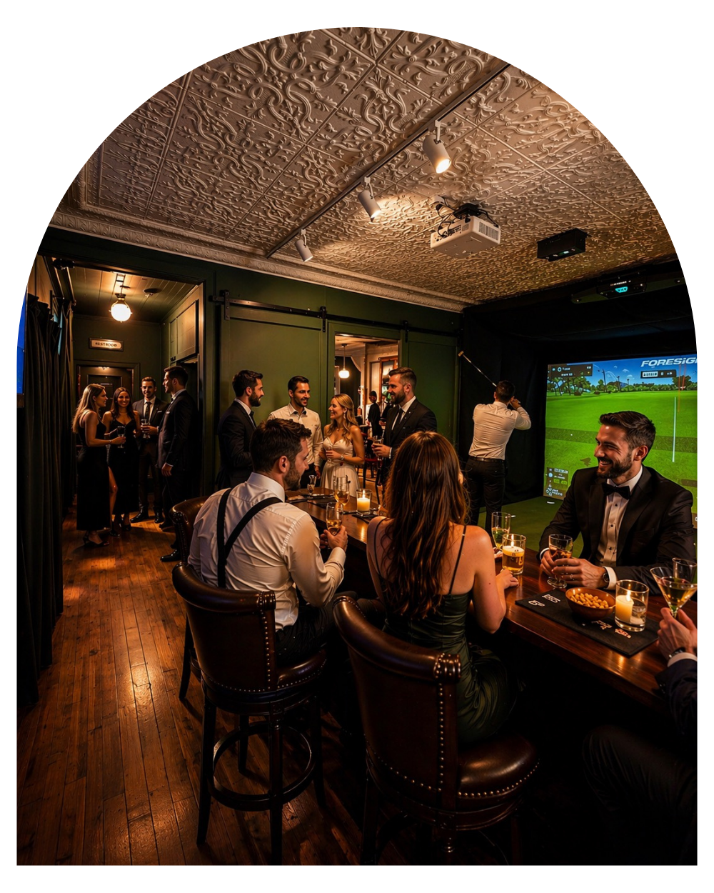 A private gathering space for your guests to kick off the weekend. 2–3 hours private access. Private Bar & Lounge, Simulator play + games. Optional drink packages available.